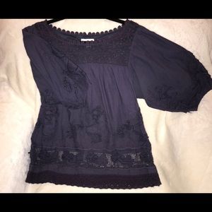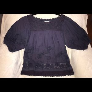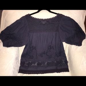 Lovely lace and crocheted details throughout. Flowing poet sleeves. 100% cotton. Partial net lining. Sits below waste.