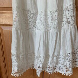 Perfect summer dress can be worn casual or ready for special events. Fully lined. Note the darling lace sleeves with a bit of trim. It is tiered and has wide lace banding ending in a deep lace and trim hem.