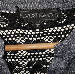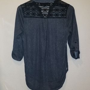 Shirt with a few buttons at the top The top of the back/shoulders are lace Hi-low cut Blue-ish gray color
