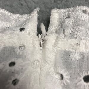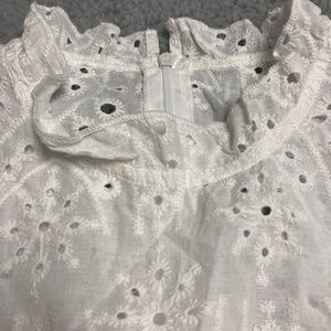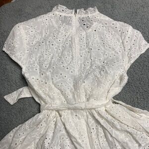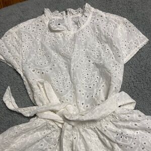 White lace blouse that is zipped up from the back and can be tied at the waste. Neckline goes up to the neck a little bit see through