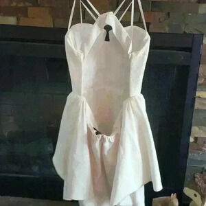Elastic straps, lace bustier bodice, open back, 2 layer skirt with asymmetrical top layer. Lined skirt.
