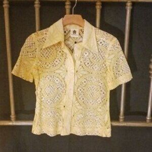 Lace, button-down, short-sleeved, "bodycon" lace blouse by Anna Huling.