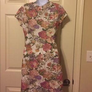 This dress is a silk underdress with a multi colored flower patterned lace overlay. Can be worn alone with sandals/wedges, dresses up for work with blazer, or worn in the fall with leggings, boots and a sweater! Hand wash cold, hang dry