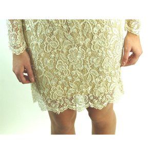 This is a stunning lace dress with pearls and sequins, perfect for a wedding or other very special occasion! The ivory lace has been embellished with hand sewn pearls and iridescent sequins. There is a long row of silk covered buttons and loops down the back. The lining of the dress is a tan or beige color silk sheath with a nylon zipper. It is boned at the front, sides and back. The boning ends at waist level. It is a very well made dress. Such detail! Very good condition. I noted a few loose threads but that is all. Dating this to the early 90s. I have other photos if you would like to see them.