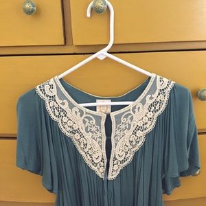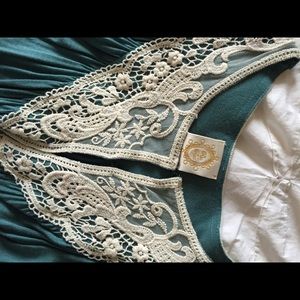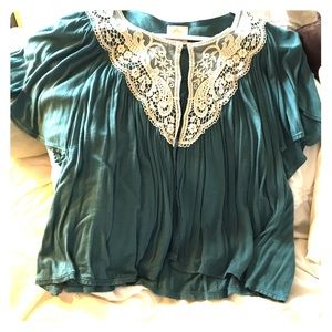 Pretty green crop top. Looks great with tank underneath. Lace embellishment around collar. EUC.