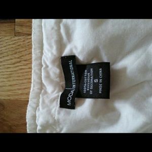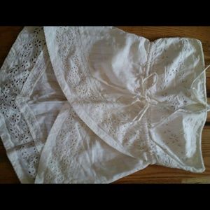 This is a strapless top with 2 ties, one at the top of the waist and on at the top of the shirt. The back is a little longer than the front but creates a real flattering look. It is in really good condition, I have only worn it a few times. It is a little bit to big for me.