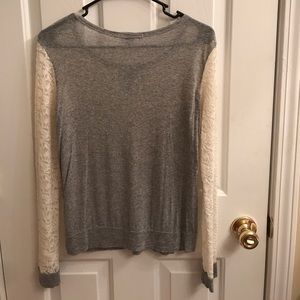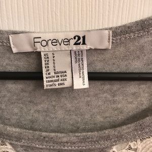 Grey shirt with white lace pattern on the front! Sleeves are see through! Is not very tight fitting!