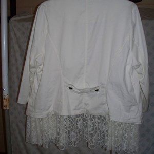 The pictures don't do this cute jacket justice!!! Beautiful lace and cotton jacket. Worn twice I do have the missing button.