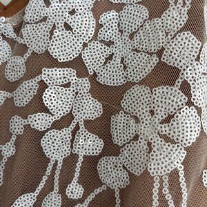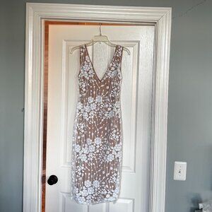 Lace lined cocktail dress, fitted, size medium, white/nude.