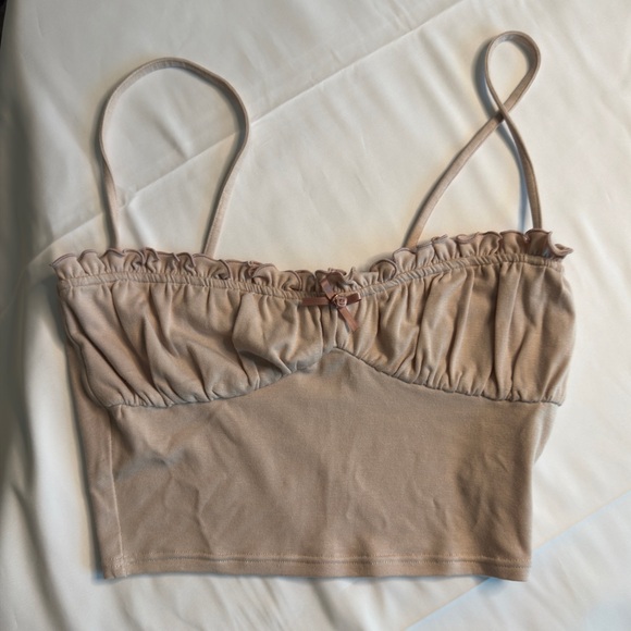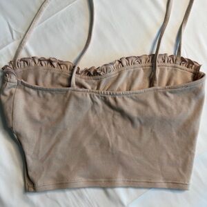 Stylish tan crop top with ruffled details and spaghetti straps.
