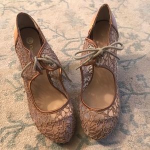 Lovely, elegant stepping out shoes, sheer lace fabric with satin heel. The laces they come with could be replaced with satin ribbon for an even more upscale look. Mild signs of wear but still fancy.