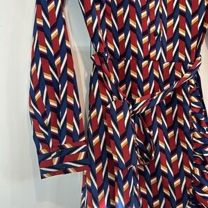 Retro geometric pattern of red, blue, yellow, black, and white collared neckline