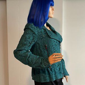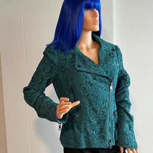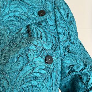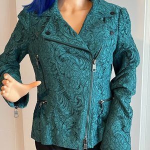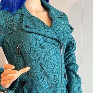 Burberry teal lace moto jacket with gunmetal zippers,sz US 12 or IT46. Measured flat fits 38/40" bust & hips, 34" waist and is 24" long. Fully lined in teal acetate/poly, the outershell lace part is 61%cotton/32%viscose/7%poly. Hange chain at interior back, seamed waist with slight ruffle back, 5.5" long cool zippers at wrists, snap down collar,dual front side zipper pockets 5.5"long, long sleeves are 18.5int/26"ext. Biker or Moto style the lace makes it extra cool, very high quality, retailed for $1600, excellent condition except buttons on collar have small scratches.