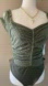 Olive knit bodysuit featuring a shirred construction, polka dot print, sweetheart neckline, short lace sleeves with ruffled trim, and a thong cut.