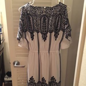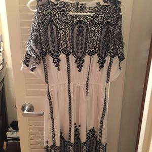 White dress with black lace pattern over it. This not actual lace on this dress. Draw string at the waist. Cutlets (not sure about proper terminology for this) between the told of the shoulder and arm. Sits right above knee.