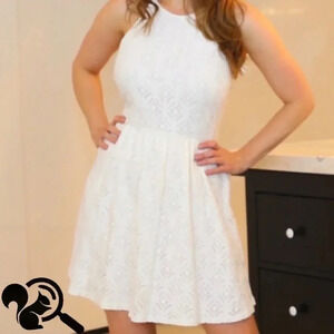 A geometric lace print covers this fully lined zip back dress in ivory.