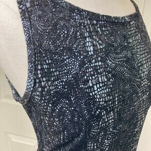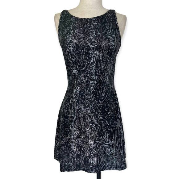 Q&A iridescent silver & black faux lace print sleeveless fit & flare little black mini dress. Excellent pre owned condition, no notable flaws. Pullover style. Fabric & size tag missing but the fabric is washable & has some stretch. Approximate measurements taken with item laying flat.