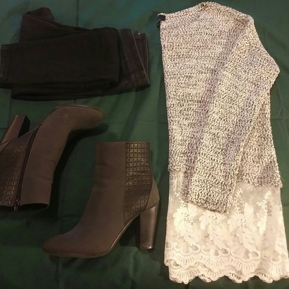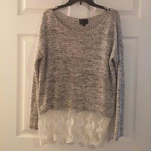 Sheer white lace panel along the bottom of this darling sweater. Can be worn on or off the shoulder. Pair with skinny jeans and ankle boots (which are also for sale in my closet!) for a chic look. Loose fitting and in excellent condition. Get it before it's gone!
