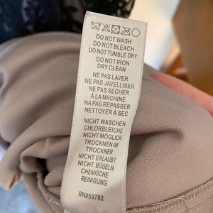 Mauve lining under black lace overlay and gathered neckline. So pretty on- I would wear this all the time but it doesn't fit anymore. My gain is your gain!