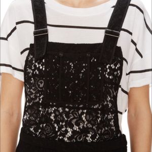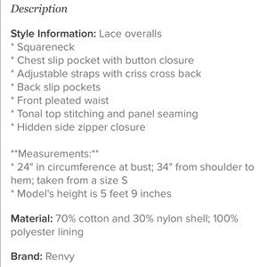 Lace overalls. Square neck. Hidden side zipper closure...please check picture 4 for details. Brand is Renvy. Imported.
