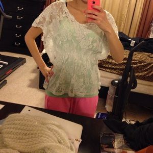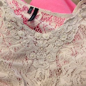 Lace. Short sleeve. Pearl embellishments on the top around the neck. Can be worn with or with out belt. ‼️belt not included‼️ flared sleeves. Kind of an elastic part in the middle. Super cute can be dressed up or down. Cream. Been worn a hand full of times. In great condition!!:)