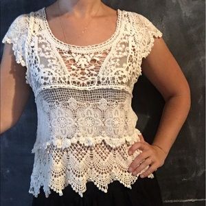 White lacy crocheted style blouse. Very comfy, light and delicate. Great with shorts, jeans or over a bikini. Any questions just ask.