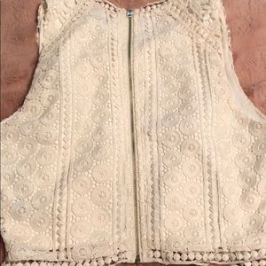 Has a zipper on the back. It’s a crop top but doesn’t show a lot of stomach