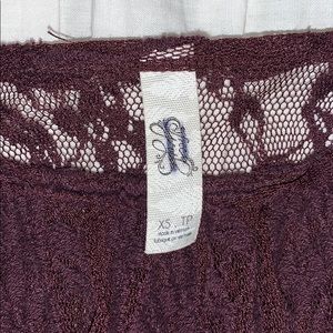 Super cute lace top. It is see through and has an open shoulder. XS but flowy making it fit bigger. Maroon color