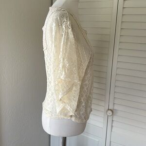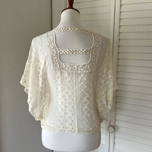 Cream colored lace top with wide, flowy half sleeves. See-through, so best worn with a cute bralette or cami underneath. Size tag is missing, but aligns with an extra small.
