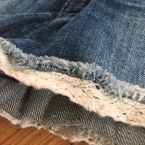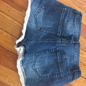 Awesome high-rise jean shorts with cute lace trim! Tags cut out.**black marks on my camera lens, not on clothing!
