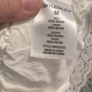 White lace trim tie back blouse. Made by Audrey parks for franchesca’s. Size medium, measures 29” at the waist, 15” long, 20” pit to pit. Flowy and versatile to dress up or down. No known flaws.