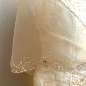 Elegant ivory strapless two-piece formal gown featuring a beautifully embroidered corset-style bodice and a flowing A-line skirt. The bodice is adorned with delicate floral embroidery, sequins, and beadwork, adding a subtle shimmer. A deep notched neckline enhances the front, while the back features a dramatic lace-up corset design with ribbon ties for an adjustable and flattering fit. The skirt is crafted from a soft satiny organza overlay that drapes gracefully to the floor, creating a timeless and romantic silhouette.