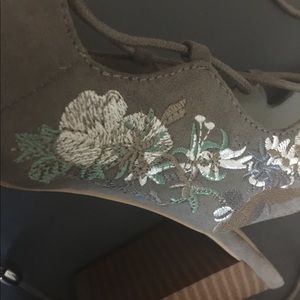 Flowers for the lady? These grey block heel sandals are such a unique pair. Wear with jeans, dresses or pretty skirts. Gently used. Like new. Ships without box.
