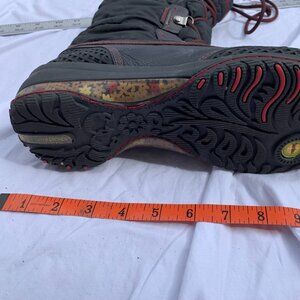 Boots have waterproof base black, round toe, leather and fabric upper, and lace up closure with maroon laces.
