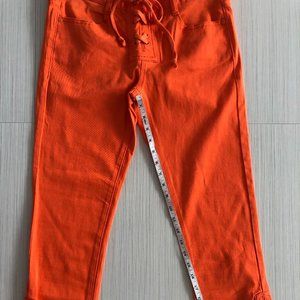 Bright orange capri pants with lace up fly and zipper accents 5" long at bottom side of legs. Size 6 measured flat fits up to 32" waist, 35" hips and has inseam of 24.5" long. Front fly lace up is 6" long, 9" drop from waistband to crotch seam, 4 pocket style , all functional, 2" long belt loops, fabric is 98%cotton/2%spandex with a firm hold with some stretch, new, never worn with size tag at waist, size 6 will fit larger size (see measure)no retail tags were $89, new, great color for summer!