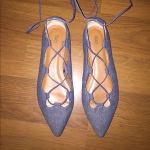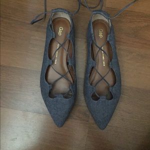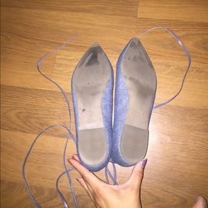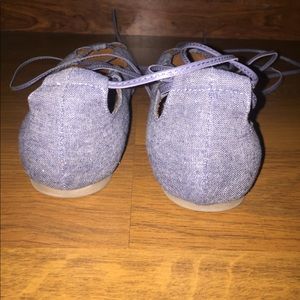 A pair of chambray lace up flats. Have been used a couple of time, do note the tips of the flats do show some wear, please reference the pictures of the point of the shoes!!