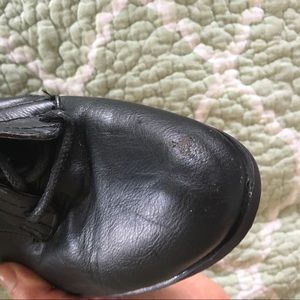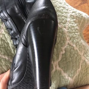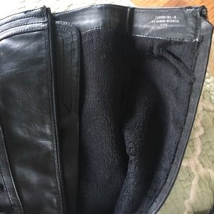 Black faux leather boots with laces, soft faux fur lining inside. Only worn once or twice, has a bit of scuffing on one toe and heels but in great shape besides that.