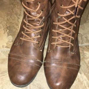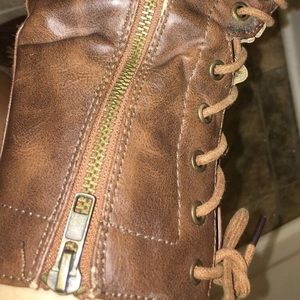 Brown, faux leather. Lace up + zipper. Adorable with high socks or with a skirt ✨