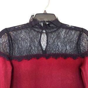 Burgundy sweater with black lace top. Two buttons located at the back of the neck. It was one of my favorite sweaters.