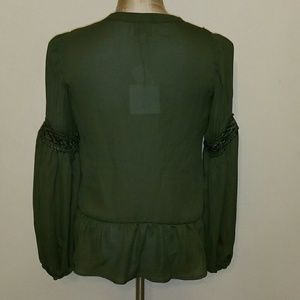 Peasant blouse with lace trim. Self-tie neckline. Long sleeves with button cuffs. Pleated sides. Pullover style. Hand wash. Size medium. Pet and smoke free environment.