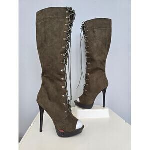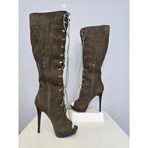 Lace-Up Knee High Stiletto Boots 8.5 Suede Look Peep Toe Army Green Alt Fashion