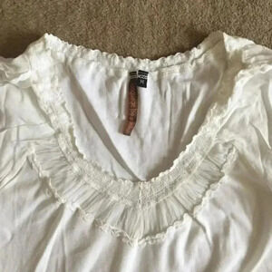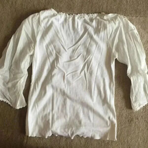 Lace collared open sleeve top. Beautiful top for going out. V-neck and lace and the sleeves slow and open up to create a beautiful, feminine look. The sleeves are tripped in a decorative lace. White and a size Medium.