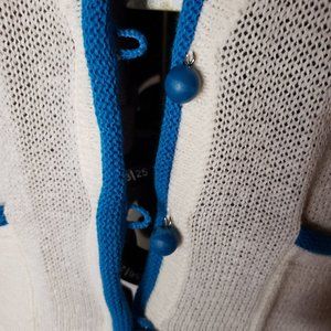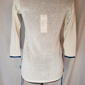 Brand New with Tags. Plenty by Tracy Reese knitted soft white cardigan sweater with blue trim. Laced side detail and 2 pockets. 3/4 length sleeves. Size Petite. Stored in a smoke-free/covid-free home.