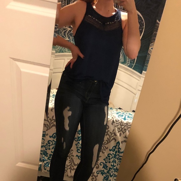 Laced around the collar with a few gems. Perfect for wearing with skirts.