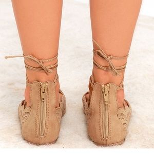 Tan cut-out laced flats with pointed toe. Shoes have a zipper in back for easy access and long laces to tie in a bow. Worn a few times, in good condition with some minor wear and tear pictures. I am a size 7, and the shoes were a bit too big for me. Fits more like a 7.5. *Last two photos were taken from Lulus.com*