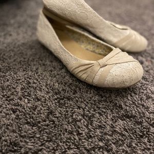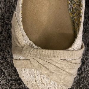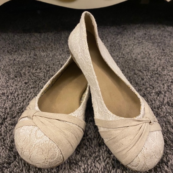 These are laced cream flats. They have a flat bow on the toe of the shoe. They also have memory foam soles.
