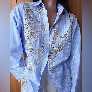 NWT, Lavishly Paris Laced Overlay Button-Down Blouses. Relaxed Fit Cotton Blend with Lace. Elegant floral mesh cutouts with