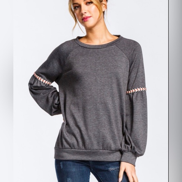 NWT! Since my boys play baseball, I guess I was drawn to this sweatshirt because the stitches on the sleeves remind me of baseball laces. The sweatshirt is solid charcoal with red, navy and ivory stitching. The inside is amazingly soft and the balloon sleeves give it an added flair. You can't go wrong with this one!