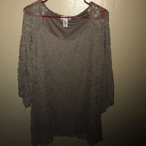 Olive green beautiful laced top.. perfect with leggings and heels or dress down with boots!! Asymmetrical bottom and sleeves. 92% Nylon/8% Spandex