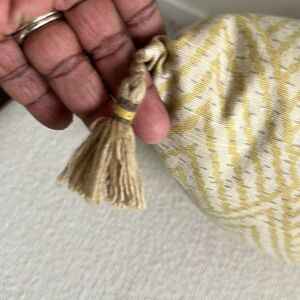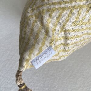 Goldish-green geometric print with tassels pillow in great condition with down pillow insert and zipper closure.